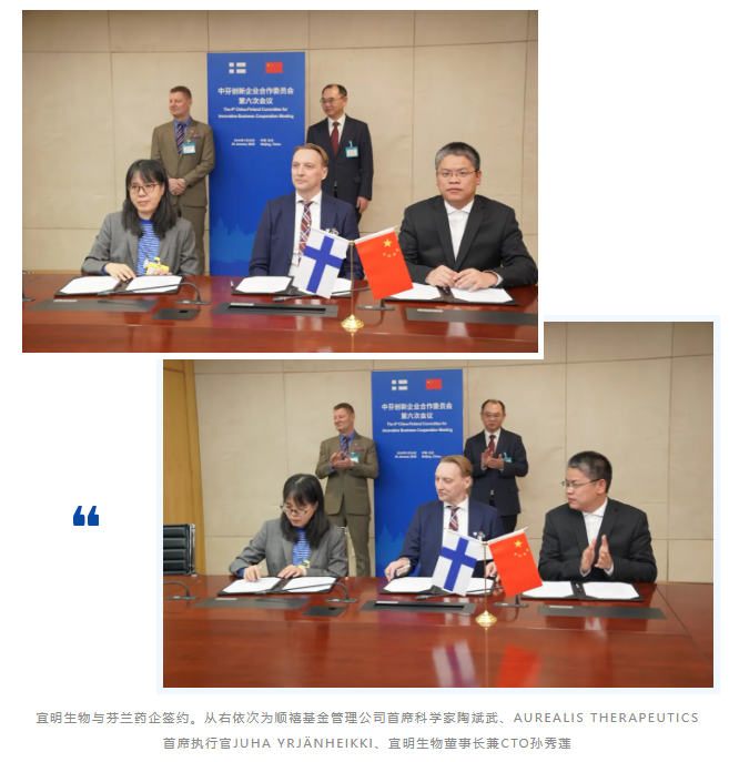 中芬创新企业合作委员会第六次会议在商务部举行,政企各界围绕创新领域合作展开深度探讨并签署多项商业协议。其中宜明生物董事长兼CTO孙秀莲博士与芬兰AUREALIS THERAPEUTICS首席执行官JUHA YRJÄNHEIKKI先生等代表各方签署协议,开展细胞与基因治疗药物项目(临床三期以及工艺验证阶段生产等)多边合作。签约仪式在中国机电商会副会长白雪峰与芬兰驻华大使馆公使衔参赞田马可(Marko Tiesmäki)共同见证下完成。
