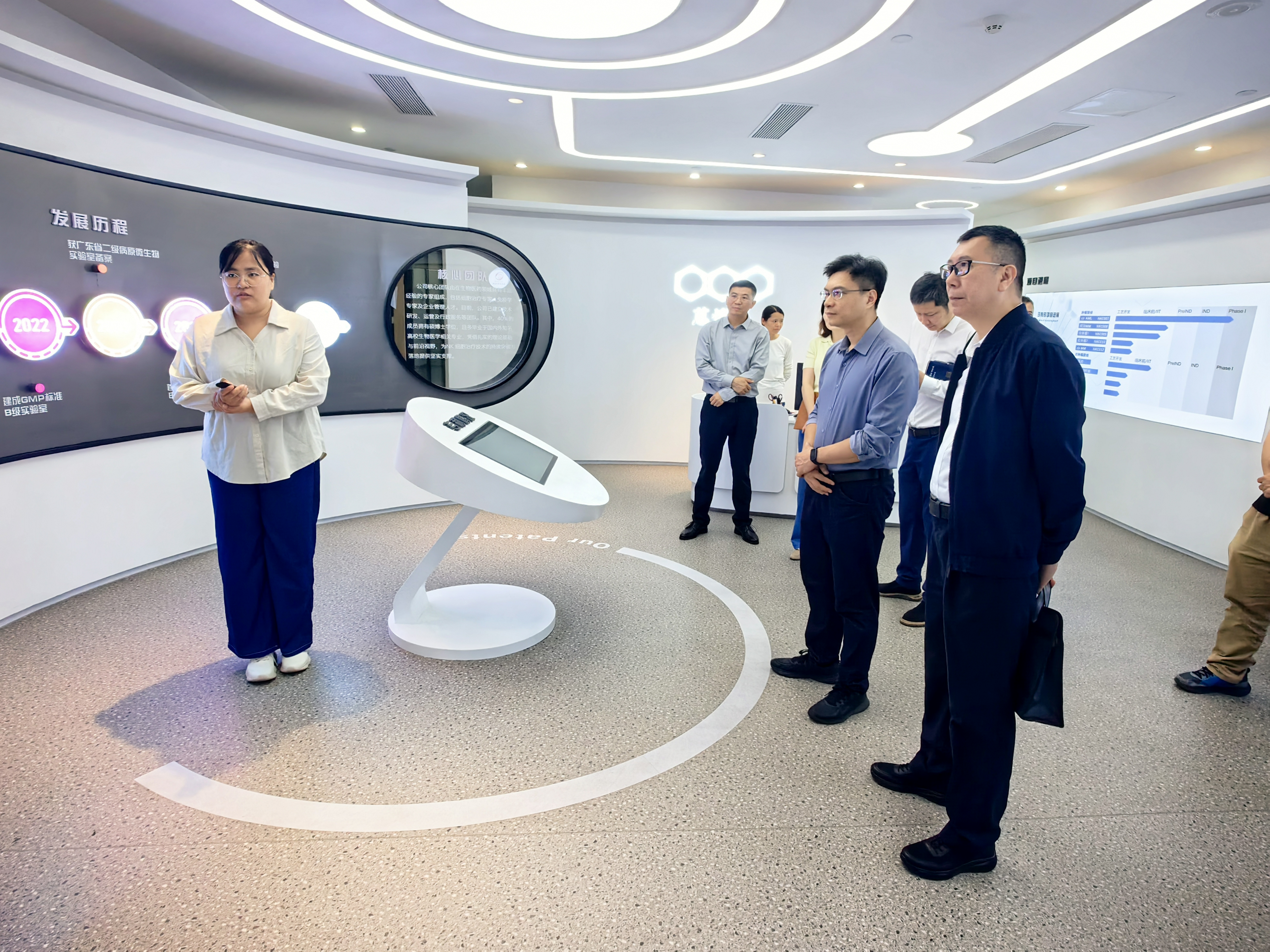 随后,来宾一行实地考察了大湾区精准医学研究院及园区企业天科雅与蒽恺赛。天科雅是一家在中国处于临床阶段的生物医药公司,专注于细胞免疫疗法在实体瘤治疗方面的创新、开发与临床转化。依托多项自主研发的细胞工程平台技术,目前正推进八条研发管线,探索免疫细胞治疗在多癌种领域的应用前景。